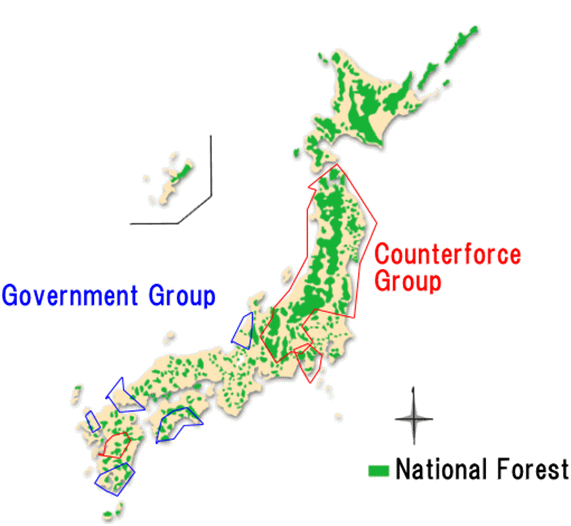 | 国有林になった場所とならなかった場所 現在の国有林の分布は、東北地方、中部地方と、一部地域に偏っている。この地域は、旧政権時に、備蓄用に大量の大径木があったこと、地方政府所有の森林を引き継いだためである。一方、京都、大阪などの大都市周辺では、日本酒製造会社が資源確保のために、大径木のある私有林を有していたことと、薪炭林や秣場として、長く利用しており、権利関係がしっかりしていたこと、長年の利用により、禿げ山が多く存在し、売却出来る大径木がないため、利益を生み出さない森林が多数に存在していたことで、国有地に組み込まれなかった。逆に、寺が所有していた森林は、宗教勢力の力をそぐため、京都周辺の森林は国有地化された。 このため、大阪周辺では、集落近郊の森林(当時は草場)は、国有林に組み込まれず、集落共通の森林として国に申請し、財産区として今日も森林を管理している。 ![]() |