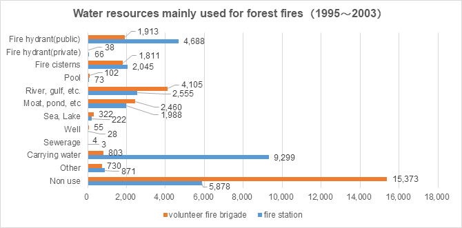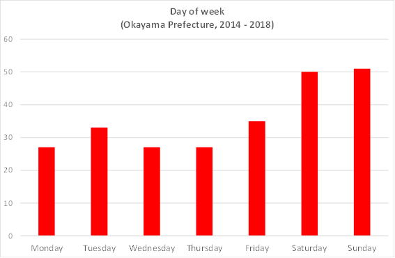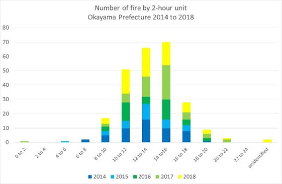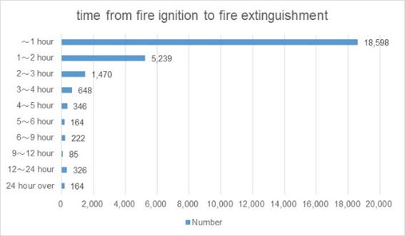 | 1.4 統計情報 林野火災の統計情報は、林野庁では無く、消防庁で整理している。消防庁では、建物火災、林野火災、車両火災、船舶火災、航空機火災、その他に分類して情報を整理している。整理されている林野火災の主な情報は、以下の通りである。 ・件数、死者数、負傷者数、延べ焼損面積、損害額 これらの情報を元に、項目毎に整理している。 ・都道府県別出火件数 ・時間帯別火災発生状況 ![]() ![]() 岡山県の時刻別発生件数(2014~2018年) ・曜日別火災発生状況 ![]() ![]() 岡山県の曜日別発生件数(2014~2018年) ・覚知から放水開始までの所要時間(5分単位) ![]() ・放水開始から鎮火までの所要時間(15分単位) ![]() ・林野火災火の出火から鎮火までの時間 ![]() ![]() ・鎮火に24時間以上要した林野火災の鎮火時刻 ![]() ・消火活動で利用した水利 ![]() ![]() ・放水開始時間と林野火災の拡大状況 ![]() ![]() ・風速と林野火災の拡大状況 ![]() ![]() 相対湿度と林野火災の拡大状況(1995~2003年) ![]() ![]() 風速と林野火災の拡大状況(1995~2003年) 1.5 林野火災の実態 林野火災の頻度の多い岡山県(2014~2018年)のデータから、曜日別発生状況では、土日に集中していることがグラフから読み取れる。また、時刻別発生状況では、10時から18時までが全体の86%を占め、人の山の出入りする時間帯に多く発生していることが読み取れる。 全国データ(1995~2003年)になるが、林野火災の2/3は、1時間以内の鎮火となっている。しかし、12時間以上は490件、24時間以上は、164件である。拡大した際の消火活動の困難さが理解できる。また、24時間以上の場合の鎮火時間も調査している。グラフから読み取れるように、夕方の時間帯が多い。これは、15~17時かけて湿気が高くなるためである。これらのデータを人員の集中投入など消火体制に反映させている。 1.6 気象と火災拡大 気象条件が林野火災に与える影響について理解しなければ、戦略的、効率的な消火活動が実施できない。また、飛び火対策として風の情報も重要である。このため、相対湿度と林野火災の被害の関係を明確にする。これらの情報を元に、消火作戦を立案している。